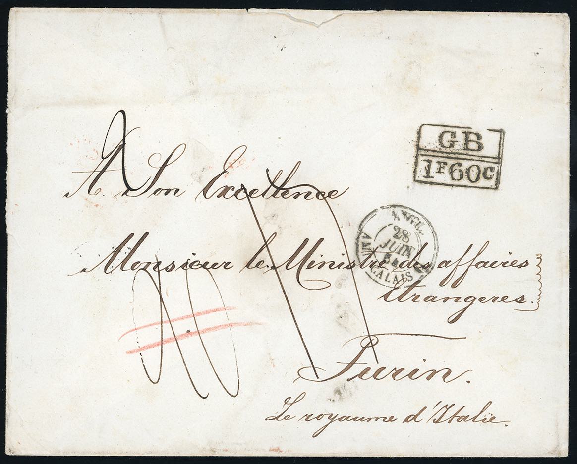 ST. THOMAS 1864 - 13 June 1864, double-rate unpaid letter from St. Thomas, Danish Antilles, to Turin. The letter was handed to the British agent who embarked it on the RMSP packet Shannon to be disembarked at Southampton on 27 June. The accountancy marking "GB/1'60", debiting France 1.60 francs for each 30 grams of weight carried to France, was applied in London. The letter was then carried to France as per the datestamp of the Travelling Post Office Calais-Paris. On arrival in Turin the double rate of 20 decimi was reduced to 1.70 lire because the addressee enjoyed free domestic postage. (ex. coll. Mentaschi).