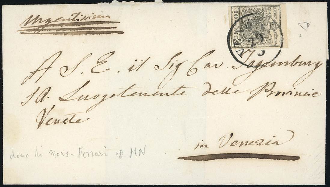 1850 - 10 cent. grigio nero, tonalità molto chiara (2c), perfetto, isolato su sovracoperta di lettera da Venezia 29/3 per città. E.Diena.