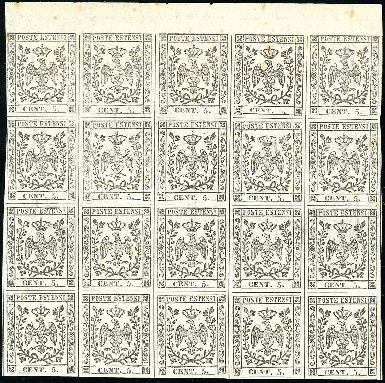 PROVE 1852 - 5 cent. bianco, prova su carta bianca, filigrana A (P21), blocco di 20 esemplari, senza gomma. Ottima qualità! Raro e ... Leggi tutto