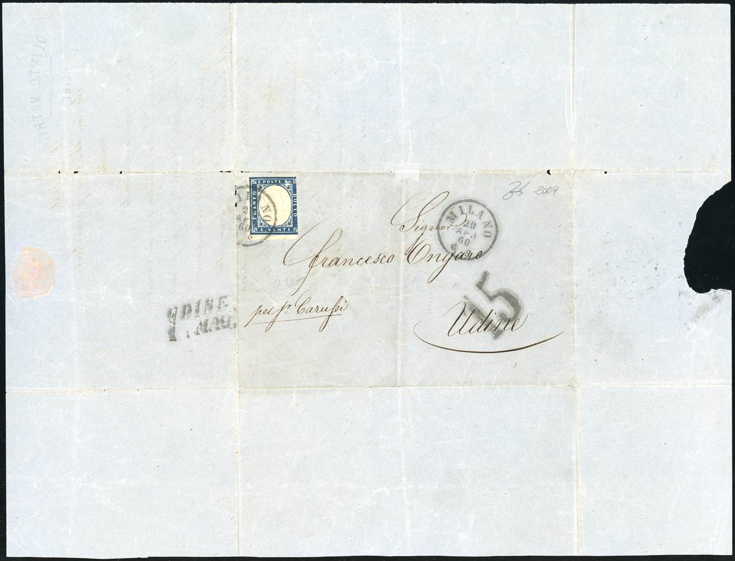 1860 - Lettera affrancata con 20 cent. IV di Sardegna da Milano 20/4/1860 ad Udine, contenente all'interno un sonetto patriottico a firma di Olinto Vatri. Interessante documento risorgimentale, che precede di un paio di settimane la partenza del Generale Garibaldi da Quarto.