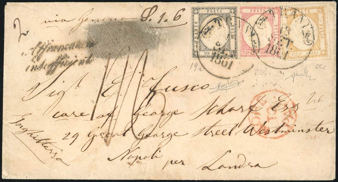 1861 - Bell'insieme di tre lettere da Trani a Londra, rispettivamente affrancate per 14 grana (20d,22c), 15 grana (21,22c), e 16 grana (19a,21e,22c), buon/ottimo stato, nel periodo 18/9/1861-30/11/1861. Raro ed interessante insieme, da studiare per le differenze di tariffa. Tutte Chiavarello, la tricolore cert. Raybaudi. Ex coll. Imperato.