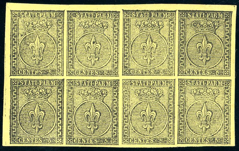 1852 - 5 cent. giallo arancio (1), blocco di 8, angolo di foglio, gomma originale integra, perfetto. Splendido e di grande freschezza. ... Leggi tutto
