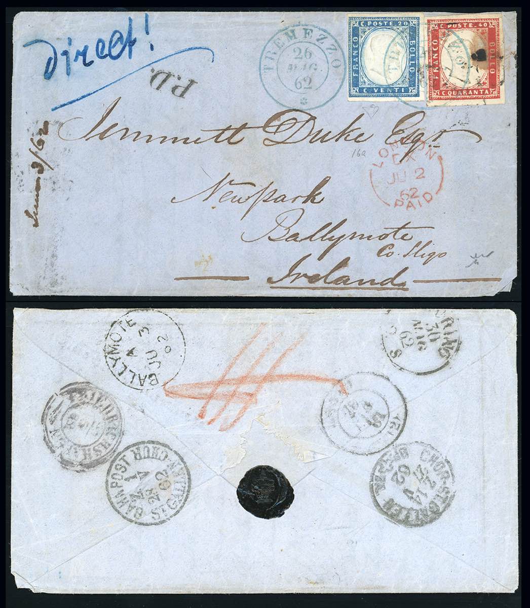 1862 - 20 cent. celeste, perfetto, 40 cent. rosso carminio (15Da,16D), ben marginati, su lettera da Tremezzo 26/5/1862 per l'Irlanda, al verso bolli di transito per la "Via di Svizzera". Molto rara! Chiavarello. Ex coll. Imperato.