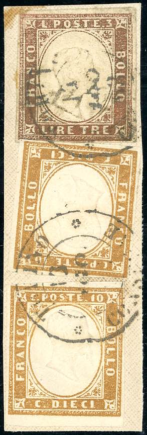 1863 - 3 lire rame, 10 cent. bistro, due esemplari (18,14E), perfetti, usati su piccolo frammento a Torino 11/8/1863. Molto raro. Em. Ed A.Diena, Raybaudi, Fiecchi, cert. Ferrario. Ex. Coll. Imperato.