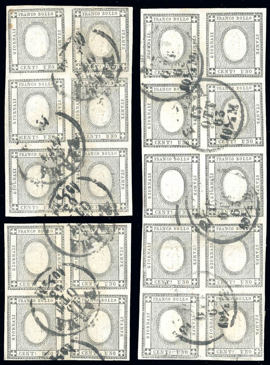 1863 - 1 cent. grigio nero per stampati (19), blocco di dieci, blocco di sei e blocco di quattro, perfetti, tutti usati a Parma 13 ottobre ... Leggi tutto