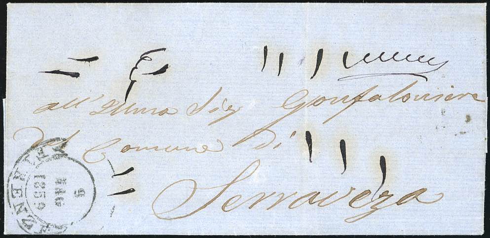 1859 - Lettera non affrancata da Firenze 9/5/1859 a Serravezza, dove giunse il 10/5/1859, ultimo giorno di Governo Provvisorio. ... Leggi tutto