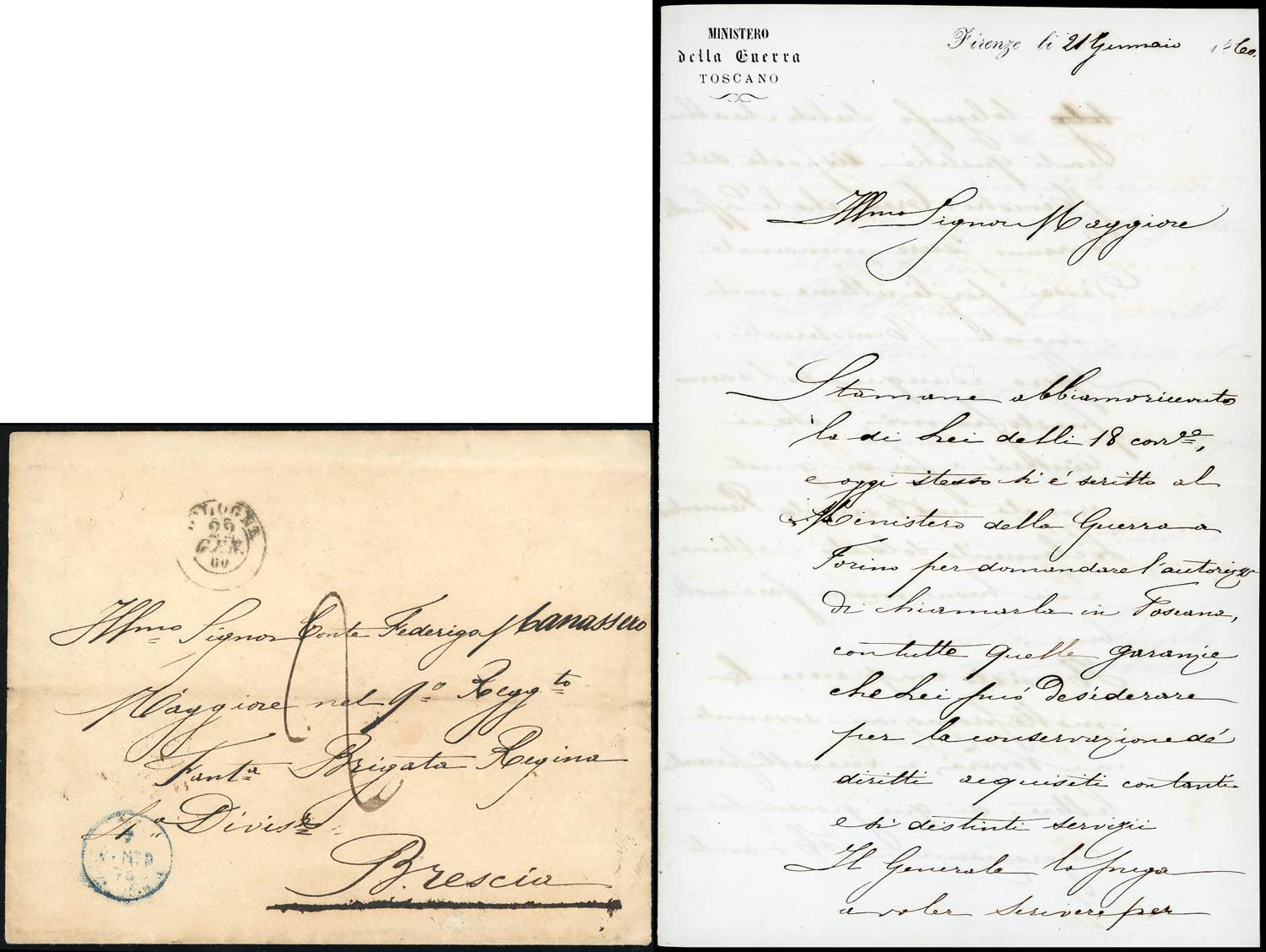 1860 - Busta non affrancata da Firenze 21/1/1860, transito di Bologna del giorno successivo sul fronte, indirizzata ad un maggiore della Brigata Regina, tassata 2. E' allegato il contenuto della missiva, un interessante testo con contenuto storico su carta intestata del Ministero della Guerra Toscano.