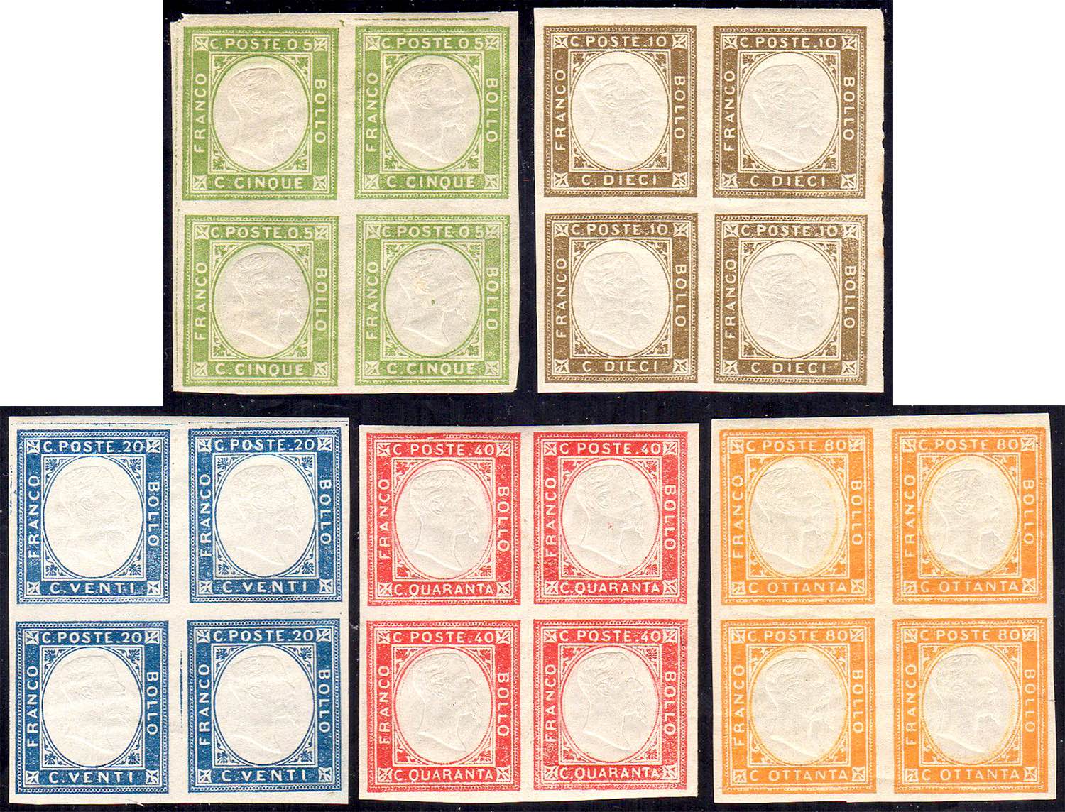 1861 - Non emessi (1/5), blocchi di quattro, gomma originale, integra per gli esemplari inferiori, perfetti. Molto freschi. A.Diena. ... Leggi tutto