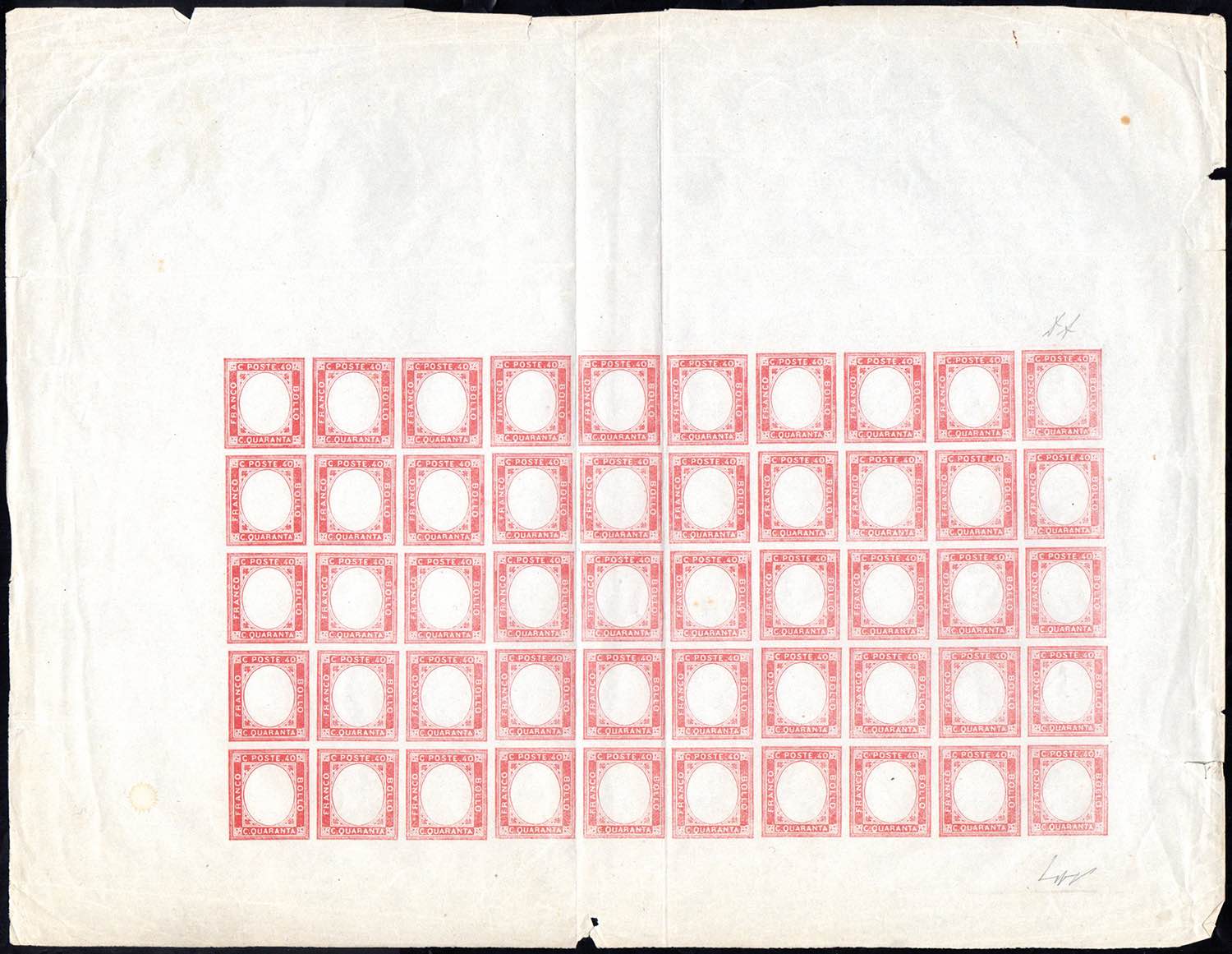 1861 - 40 cent. vermiglio, non emesso, SENZA EFFIGIE (4), foglio di 50 esemplari, non gommato e non tosato ai margini, perfetto. Splendido e molto raro! A.Bolaffi, cert. A.Diena.