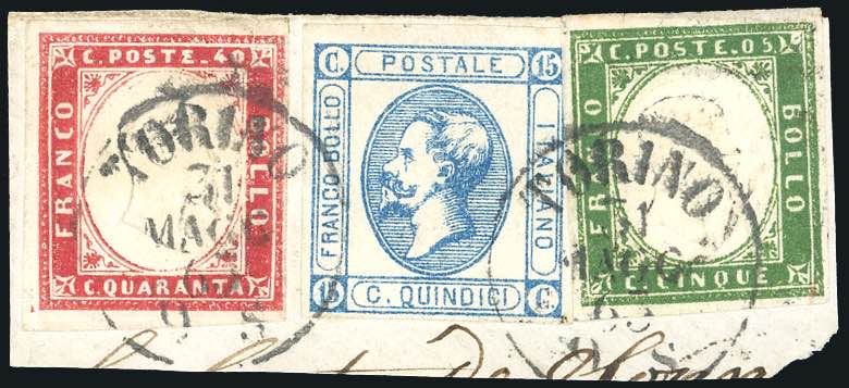 1863 - 15 cent. Litografico, I tipo (12), in affrancatura mista con 5 cent. verde e 40 cent. rosa carminio IV emissione di Sardegna (13Ea,16E), tutti perfetti, usati su frammento a Torino 31/5/1863. Bella affrancatura tricolore "patriottica". Ferrario.