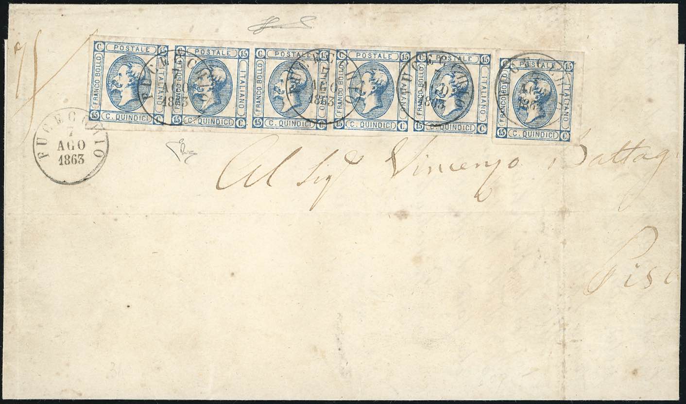 1863 - 15 cent. Litografico, II tipo, striscia orizzontale di cinque, perfetta, e singolo, lieve piega verticale (13), su sovracoperta di lettera da Fucecchio 7/8/1863 a Pisa. Rara. Ferrario, cert. E.Diena.