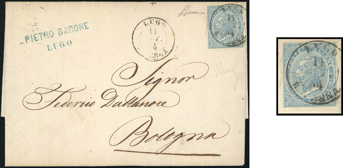 1864 - 15 cent. De la Rue, tiratura di Londra, non dentellato (L18c), margine sfiorato in alto a sinistra, su lettera da Lugo 11/10/1864 a Bologna. Molto raro, pochissime lettere note! Em.Diena, cert. Diena e Ferrario.