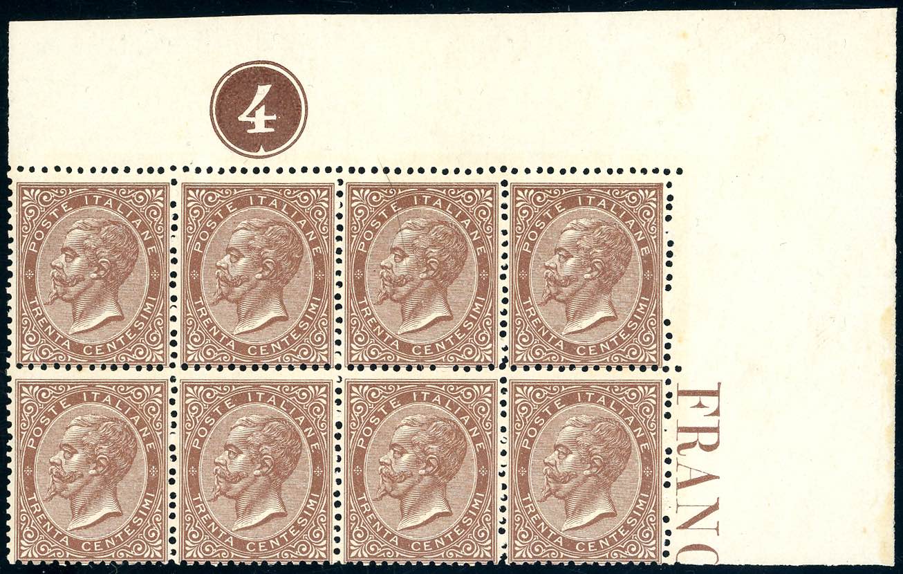 1866 - 30 cent. bruno castano, tiratura di Torino (T19), blocco di otto angolo di foglio, gomma originale integra, perfetto. Molto bello. ... Leggi tutto