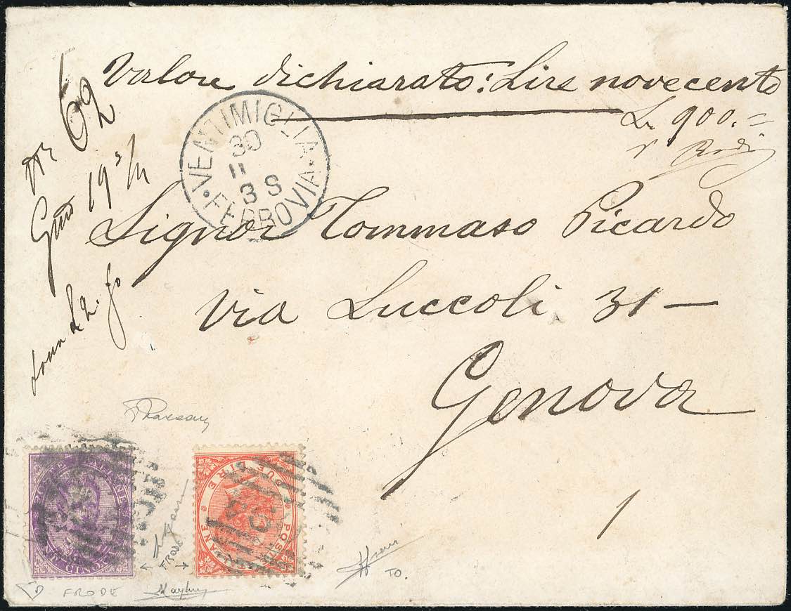 1885 - 2 lire De La Rue, tiratura di Londra, in affrancatura mista con 50 cent. Umberto I, riutilizzato in frode postale (T22,42), su busta assicurata con valore dichiarato di 900 lire da Ventimiglia 30/11/1885 a Genova. Interessante e pregevole lettera. Sorani, Vaccari, cert. E.Diena e Raybaudi.