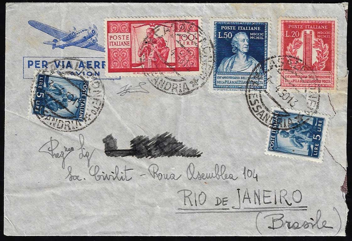 1950 - 20 e 50 lire Volta, 100 lire, 5 lire, due esemplari, Democratica (611/612,565,555), perfetti, su aerogramma da Casale Monferrato 3/4/1950 per il Brasile. Ferrario.
