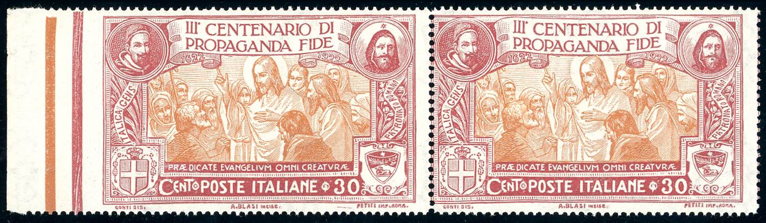 1923 - 30 cent. Propaganda Fide, coppia orizzontale, il primo esemplare non dentellato a sinistra (132e), bordo di foglio, gomma originale ... Leggi tutto