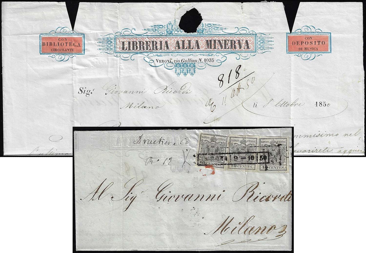 1850 - 10 cent. grigio nero, I tiratura (2b), tre esemplari, uno con bella varietà di clichè, piega verticale su un francobollo, su lettera da Verona 9/10/1850 a Milano. All'interno è presente una en-tète in tricromia, assai rara per il periodo. Cert. Bottacchi.