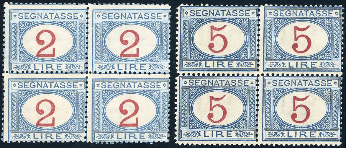 1903 - 2 e 5 lire azzurro e carminio (29/30), blocchi di quattro perfetti, gomma originale integra. Molto freschi e non comuni in blocchi. ... Leggi tutto