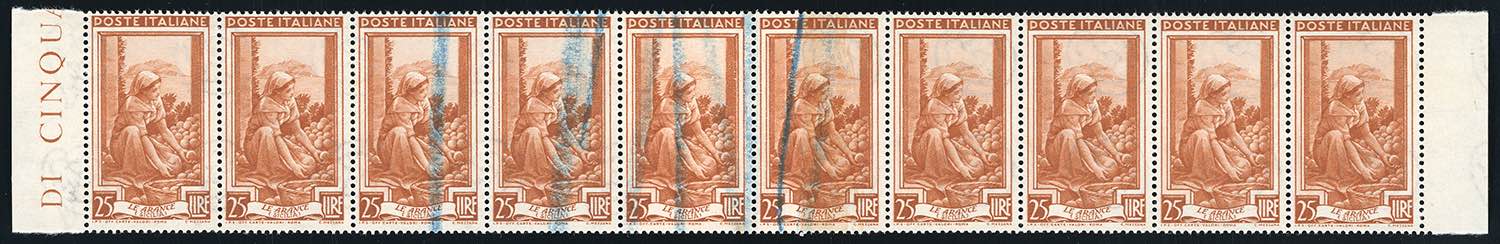 1950 - 25 lire Lavoro, filigrana ruota, striscia orizzontale di 10, bordo di foglio, due esemplari stampati su carta ricongiunta (643/In), gomma originale integra, perfetta, consueti segni di biffatura. Rara. Ferrario.