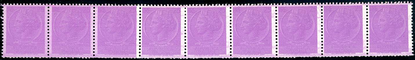 1955 - 25 lire Siracusana, stampa molto impastata, senza filigrana (Sass. Spec. P88), prova per macchinette distributrici, stampato in bobina, striscia orizzontale di nove esemplari, gomma integra, perfetta. Molto bella e non comune. Ferrario.