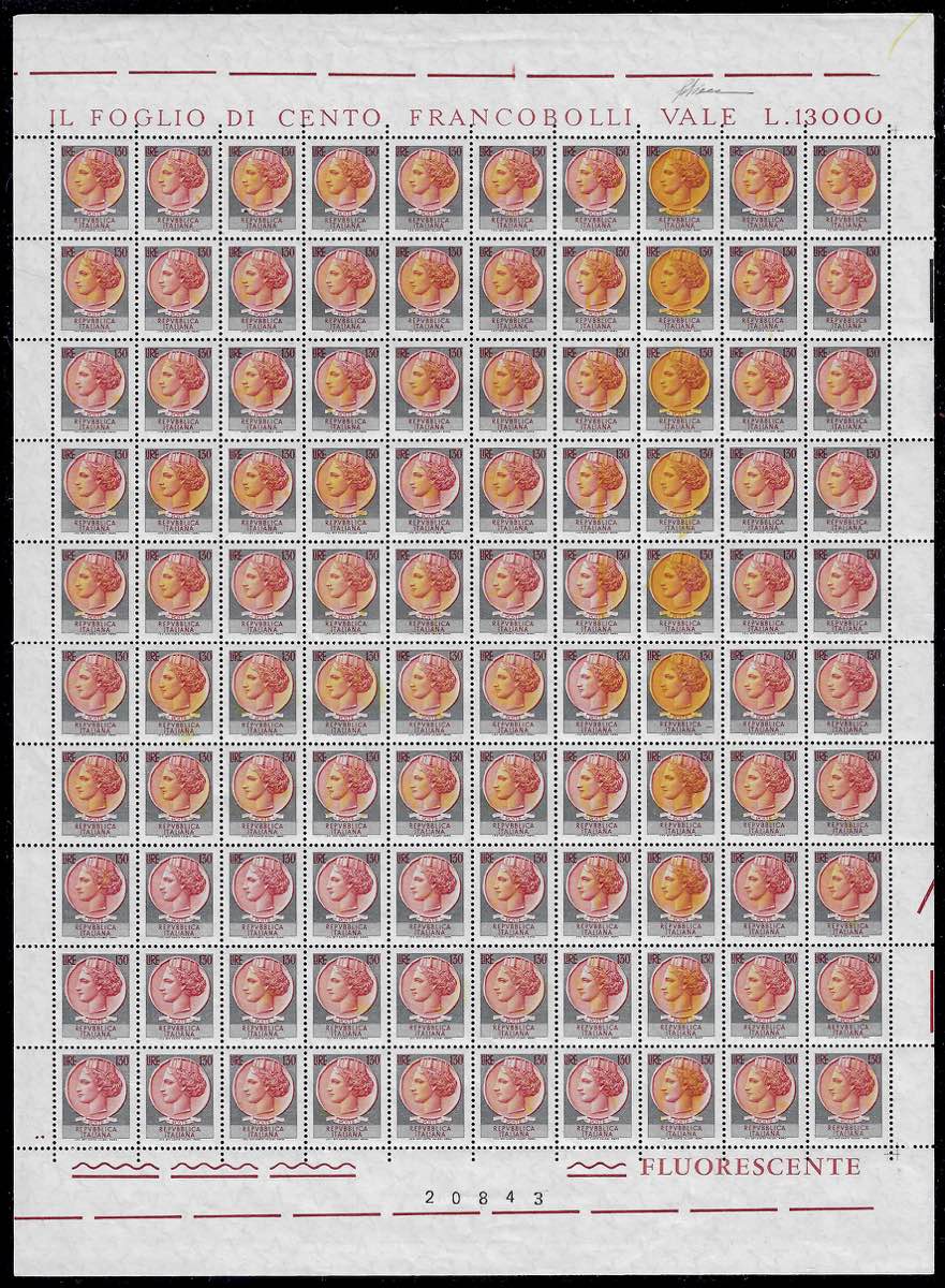 1968 - 130 lire Siracusana (1082), foglio completo di cento esemplari con eccessiva inchiostrazione del colore giallo su quasi tutti gli ... Leggi tutto