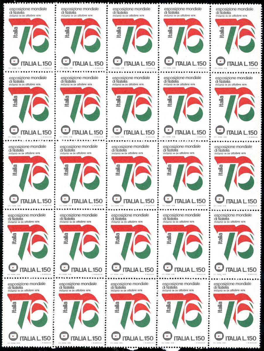 1976 - 150 lire Italia 76, per posta (F1328), blocco di 25 esemplari, nuovo, gomma originale integra, perfetto. Ferrario.