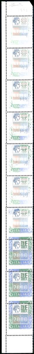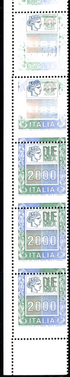1978 - 2.000 lire Alti valori (1439), striscia verticale di 10, angolo di foglio, stampa incompleta/evanescente della cornice e colori del ... Leggi tutto