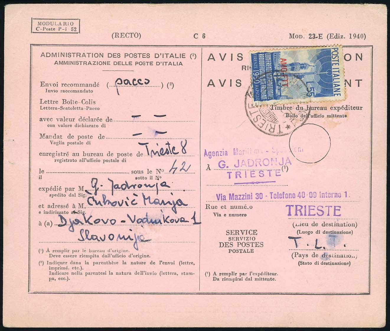 1950 - 55 lire Radiodiffusione (77), ottimo stato, isolato su avviso di ricevimento annullato, Trieste 28/7/1950. Rarissimo uso isolato, probabilmente unico di un pacco raccomandato per la Grecia.