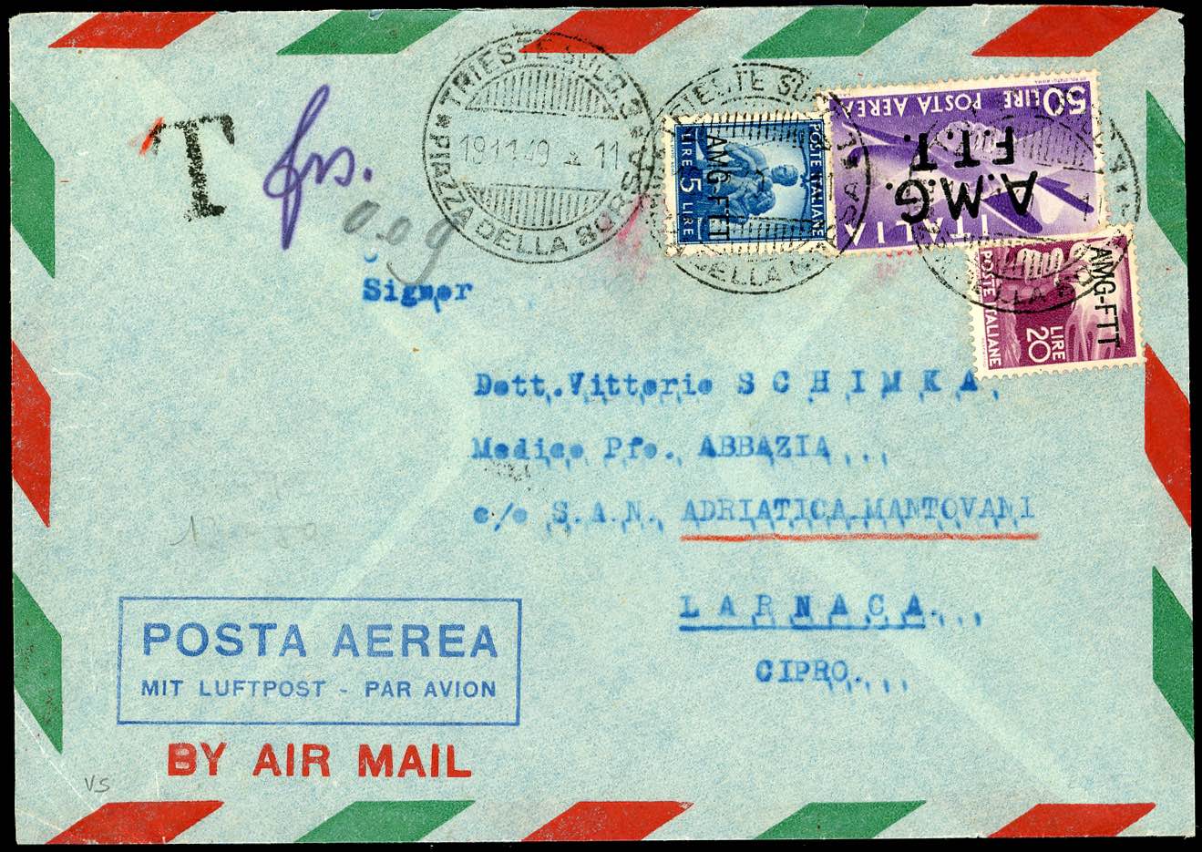 POSTA AEREA 1949/50 - Tre aerogrammi con differenti affrancature comprendenti francobolli di posta aerea, tutti indirizzati a Cipro. Interessanti e non comuni.
