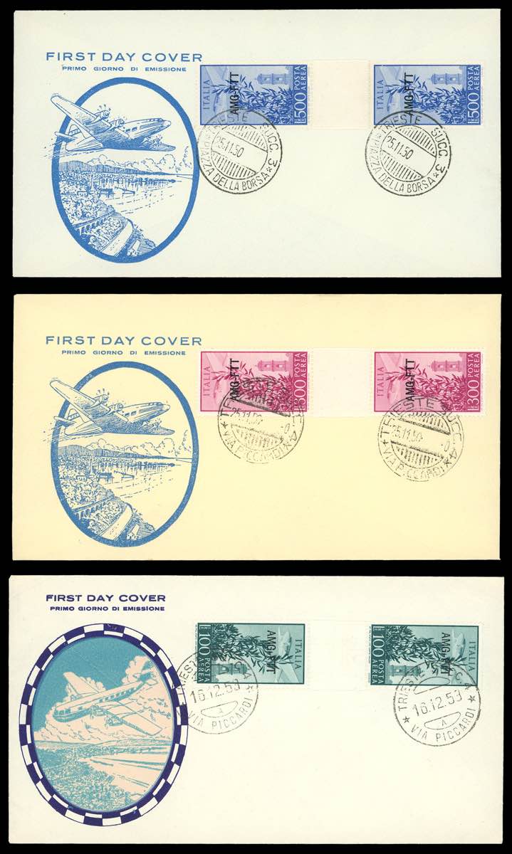 POSTA AEREA 1950/53 - 100 lire, 300 lire, 500 lire Campidoglio (23/25), coppie verticali con interspazio di gruppo al centro, usate su tre buste FDC non viaggiate. Raro insieme.
