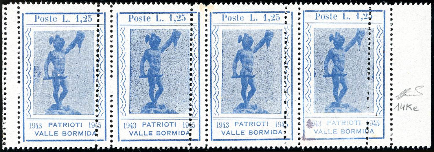 VALLE BORMIDA 1945 - 1,25 lire azzurro Perseo, striscia orizzontale di quattro con doppia dentellatura nei lati verticali (14Ke), nuova, ... Leggi tutto