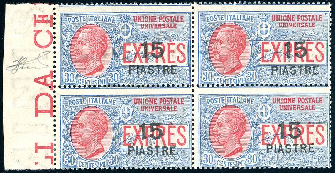 COSTANTINOPOLI ESPRESSI 1922 - 15 pi. su 30 cent. soprastampa più grande (2), blocco di quattro, gomma originale integra, perfetto. Raro. ... Leggi tutto
