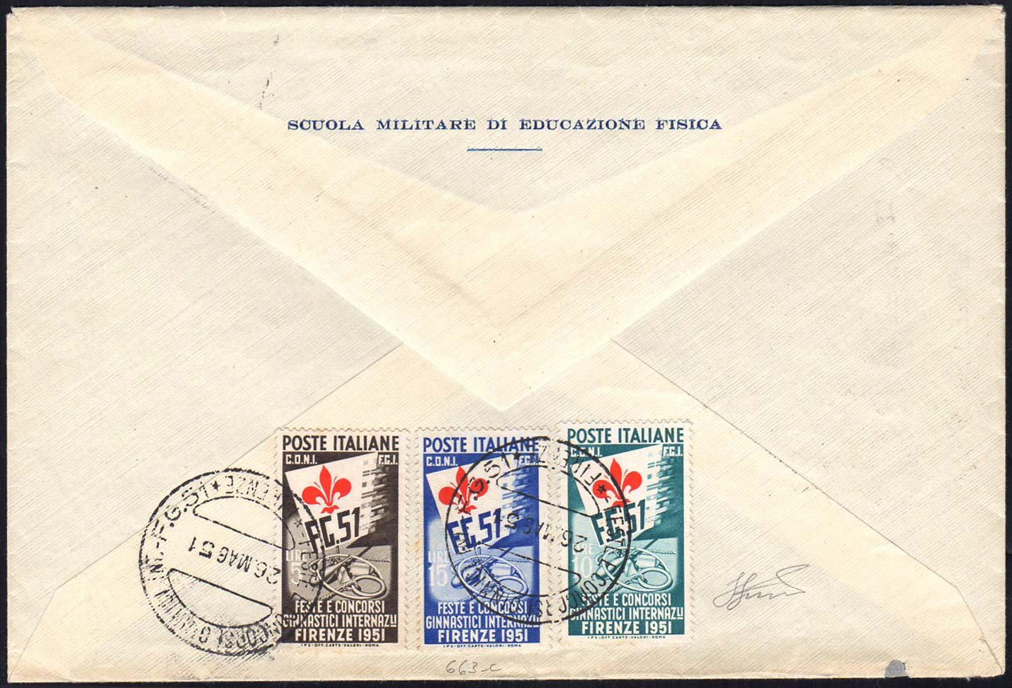 1951 - Ginnici, serie completa con il valore da 15 lire con varietà "giglio spostato a sinistra" (661,662,663c), perfetti, usati al verso di busta non viaggiata con annullo speciale della manifestazione Firenze 26/5/1951. Cert. Ferrario.