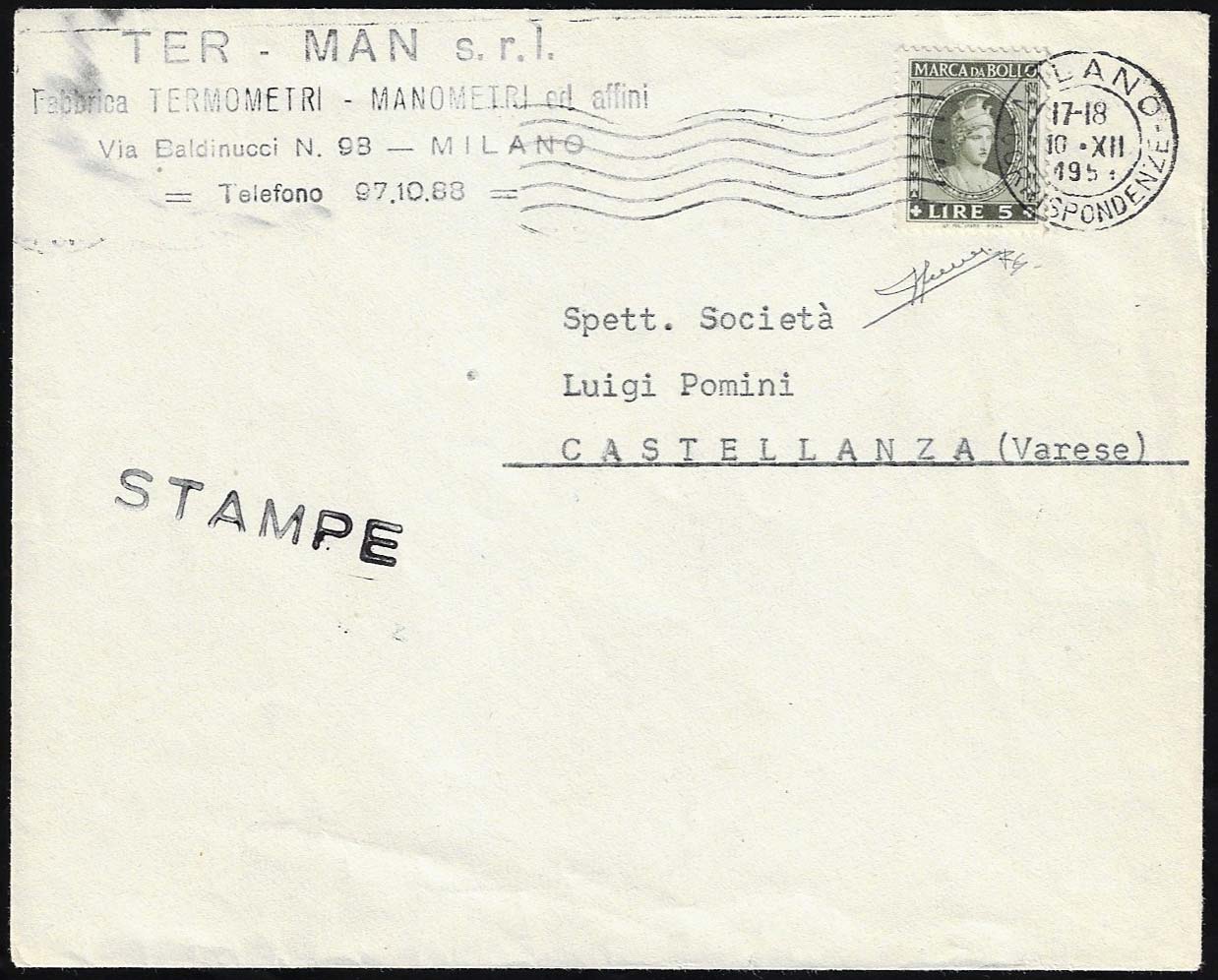 Lotto 2056 - 1951 - 5 lire marca da bollo, perfetta, su busta da Milano ...