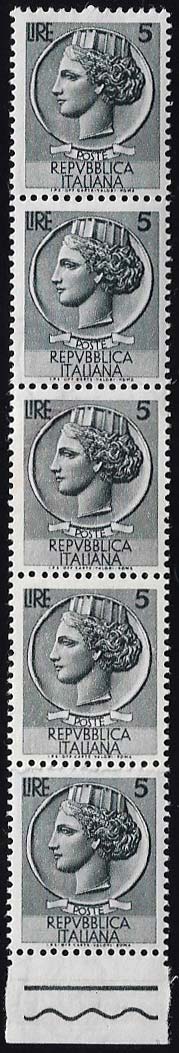 1953 - 5 lire Siracusana, filigrana ruota, striscia verticale di cinque, due esemplari stampati su carta ricongiunta (710c), gomma integra, perfetta. Ferrario.