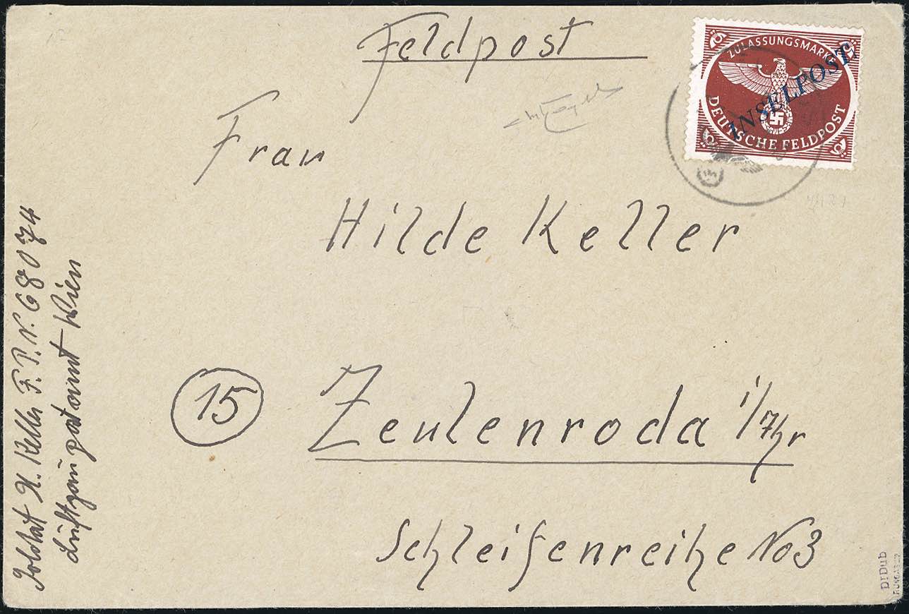 OCCUPAZIONE TEDESCA EGEO 1944 - Inselpost bruno rosso, soprastampa Agram dent. 13 3/4 (6), perfetto, su busta dalla Feldpost n.68074 7/2/1945 a Zeulenroda. Cert. Raybaudi e Rungas.
