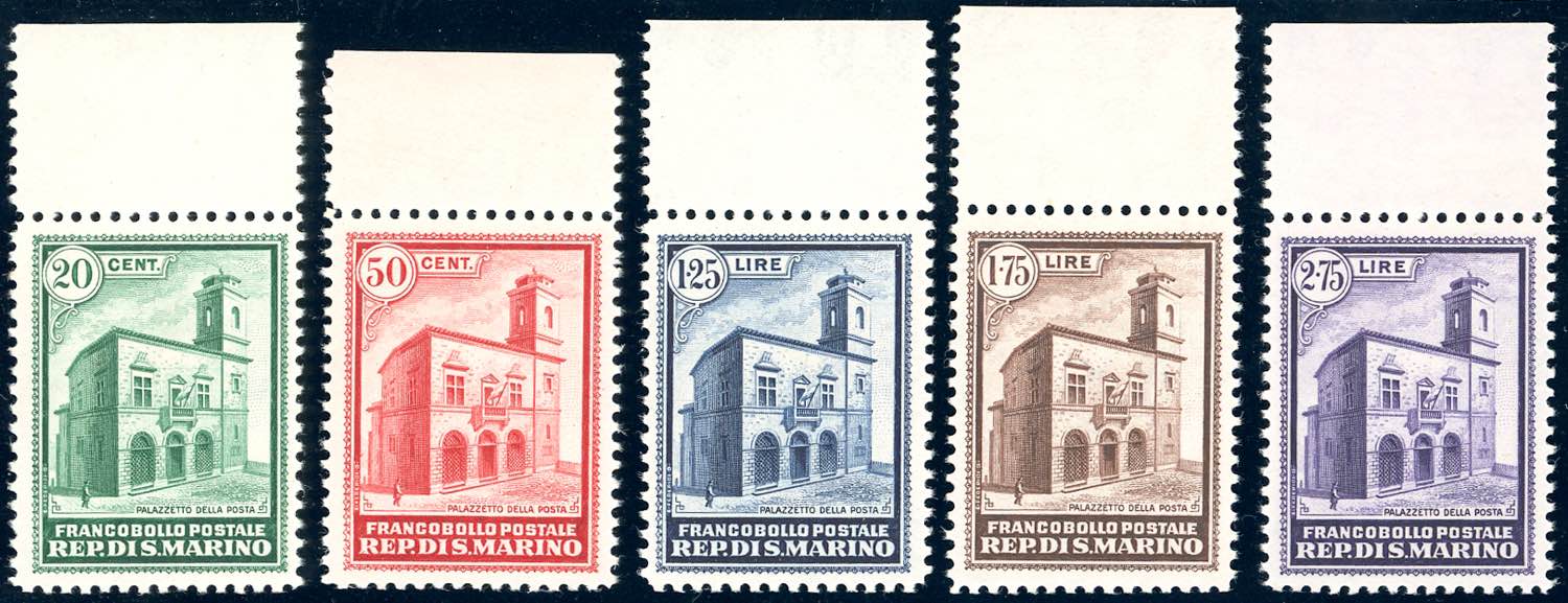1932 - Palazzetto della Posta (159/163), bordo di foglio, gomma originale integra, perfetti. Molto belli! Cert. E.Diena per gli alti valori.