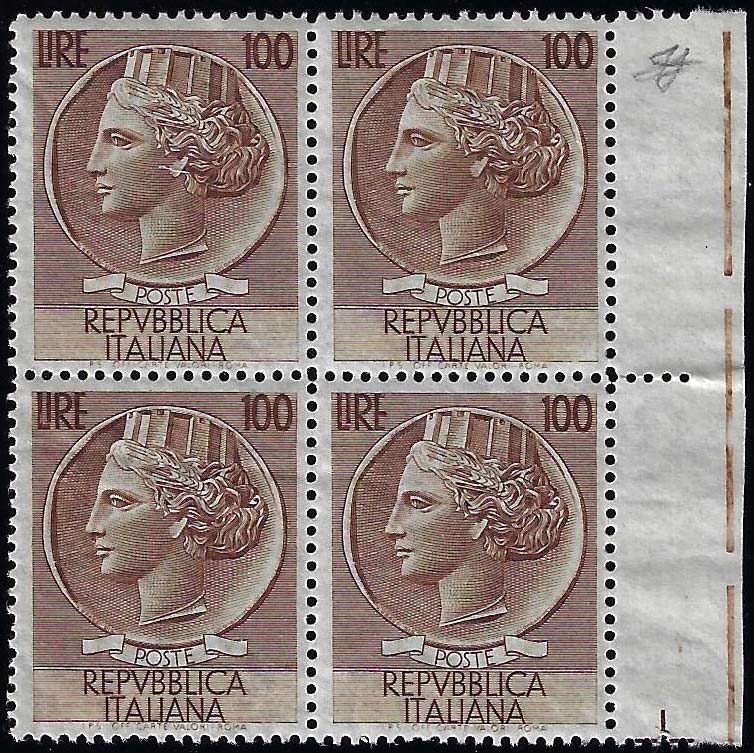 Lotto 2068 - 1954 - 100 lire Turrita, filigrana ruota (747), blocco di ...