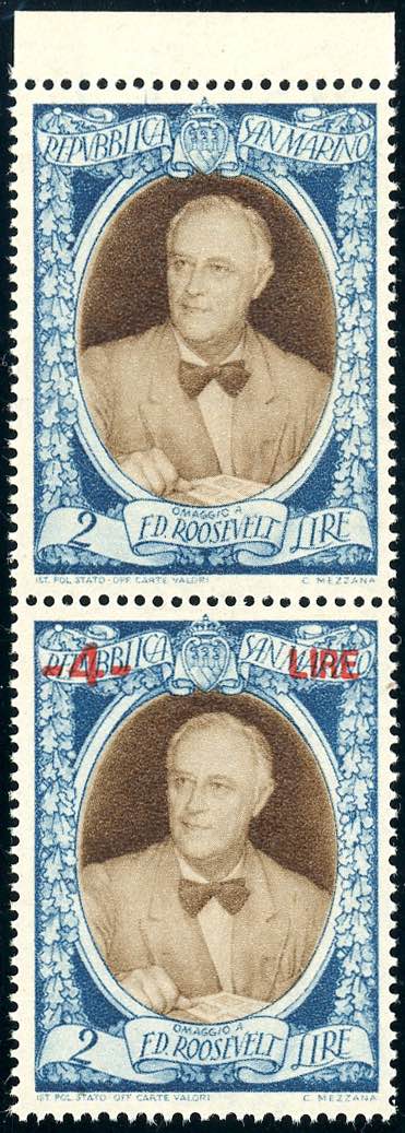 1947 - 4 lire su 2 lire Roosvelt, coppia verticale con l'esemplare superiore senza soprastampa e quello inferiore con soprastampa spostata ... Leggi tutto