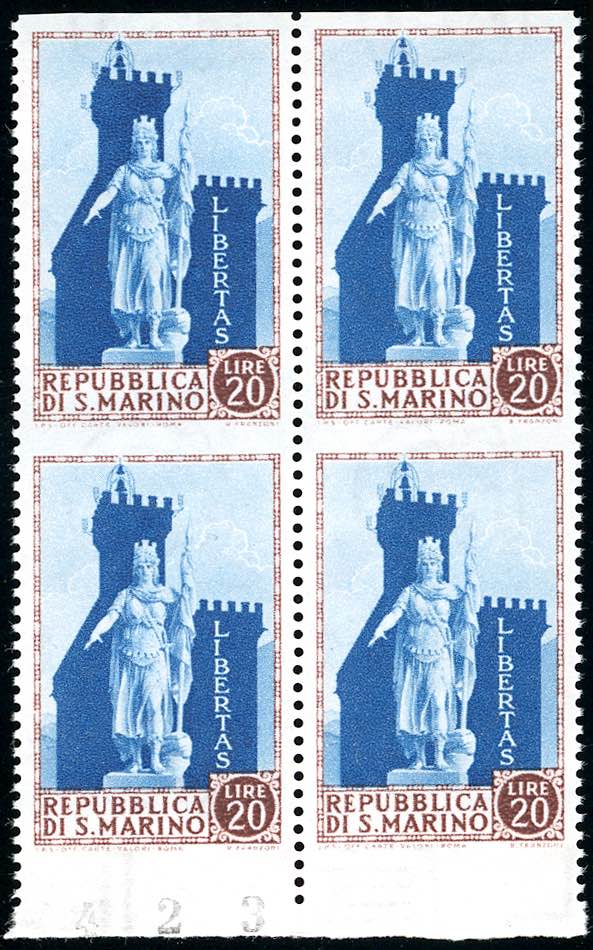 1954 - 20 lire Statua della Libertà, non dentellato orizzontalmente (420b), blocco di quattro, bordo di foglio, gomma originale integra, ... Leggi tutto