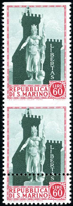1954 - 60 lire Statua della Libertà (421), coppia verticale non dentellata orizzontalmente e in alto, l'esemplare inferiore con doppia dentellatura in basso, gomma originale integra, perfetta. Ferrario.