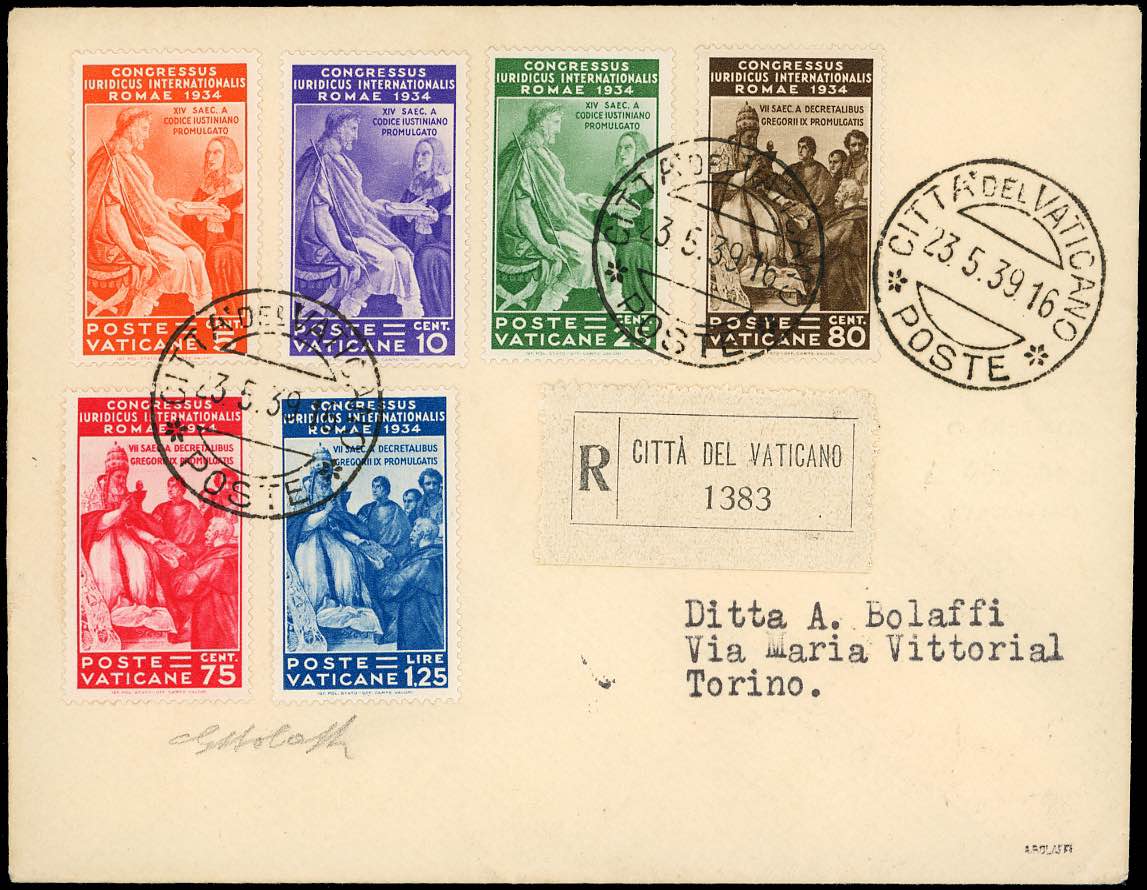 1939 - Giuridico, serie completa (41/46), perfetti, su busta raccomandata da Città del Vaticano 25/3/1939 a Torino. G.Bolaffi.