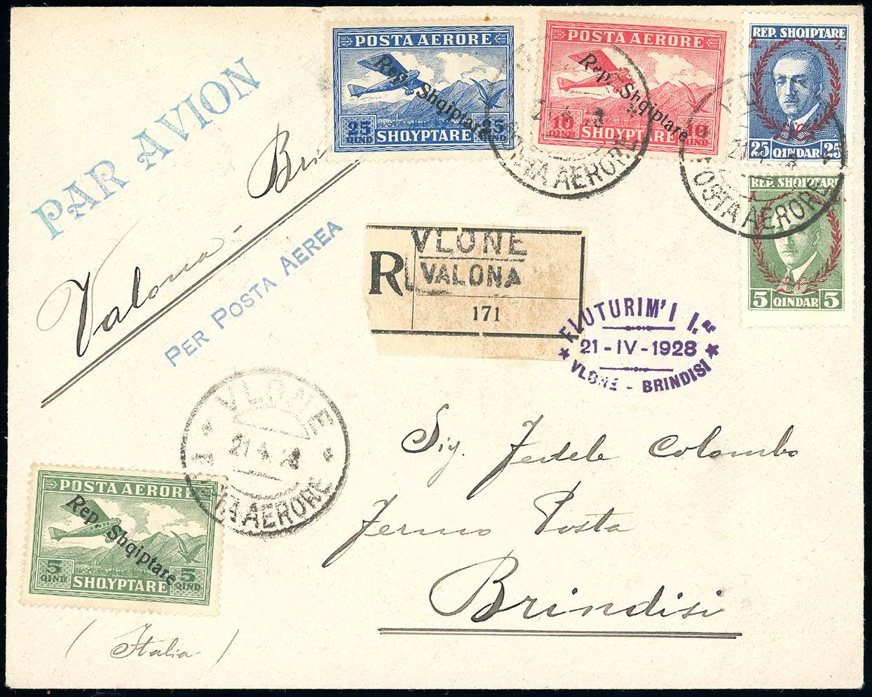 ALBANIA POSTA AEREA 1928 - Aerogramma raccomandato affrancato da Valona trasportato con il volo speciale Valona-Brindisi del 21/4/1928. Non comune.