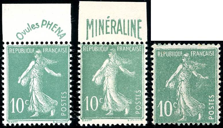 FRANCIA 1924 - 10 cent. Seminatrice, serie di tre valori con due esemplari con appendice (188,188A,188B), nuovi, gomma originale integra, perfetti. Ferrario.