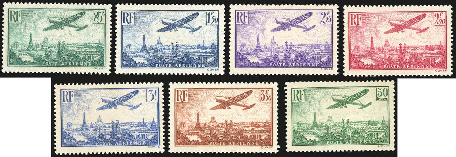 FRANCIA POSTA AEREA 1936 - Aereo in volo su Parigi, serie completa (A8/A14), nuovi, gomma originale integra, perfetti. Ottima qualità. Il 50 franchi cert. Ferrario.