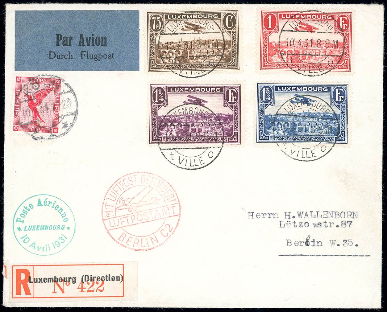 LUSSEMBURGO POSTA AEREA 1931 - Aerogramma raccomandato con affrancatura mista Lussemburgo-Germania del 10/4/1931 per Berlino.