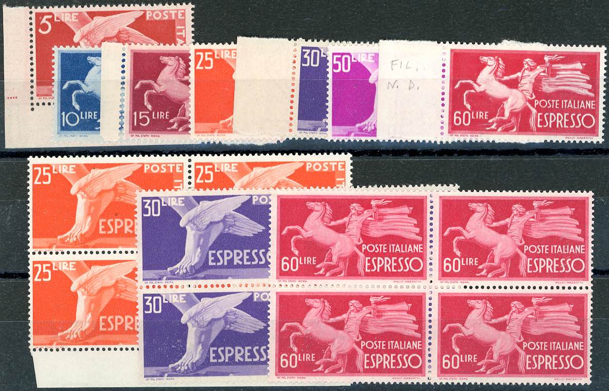 REPUBBLICA ITALIANA 1945/1952 - Piccolo ma interessante insieme di servizi del periodo. Inoltre quattro esemplari di posta ordinaria in blocchi angolari di cinque. Tutti i francobolli hanno gomma integra e sono generalmente di buona qualità. Ottimo per dettaglio.