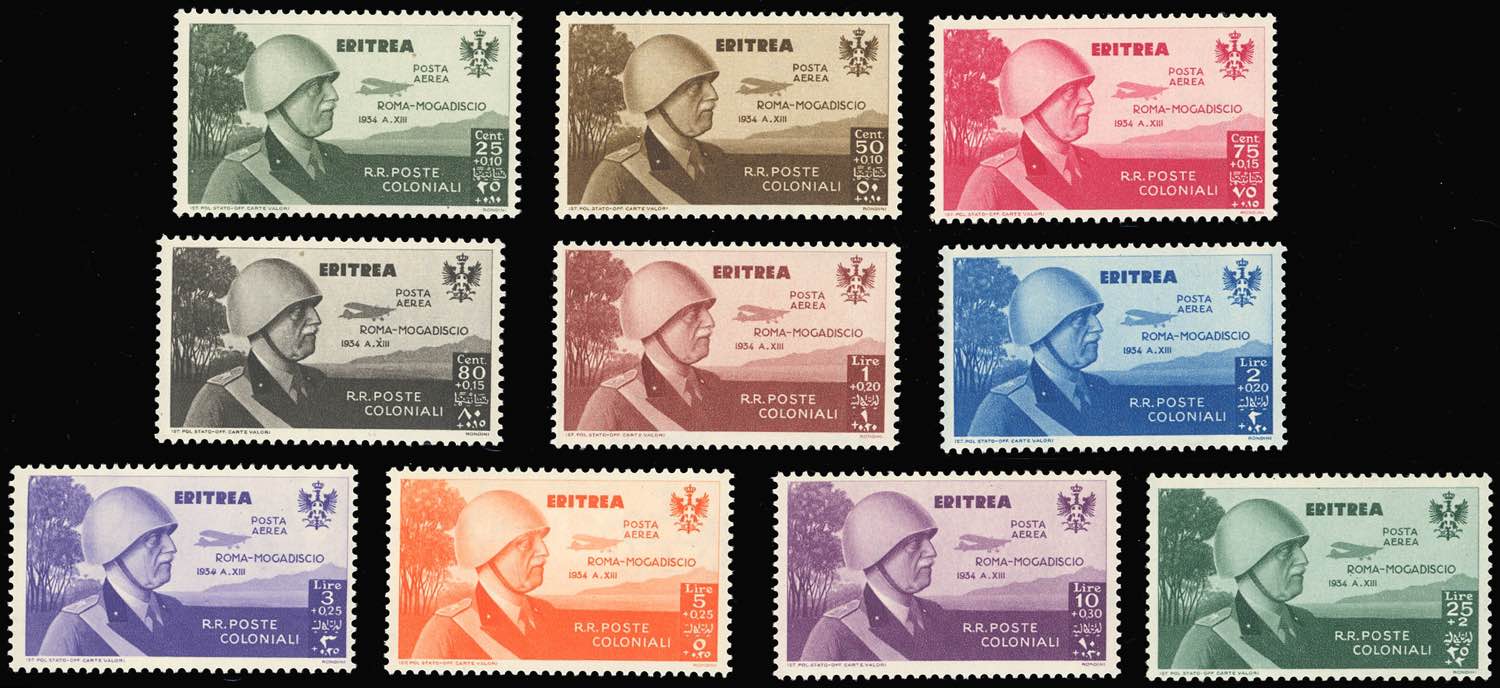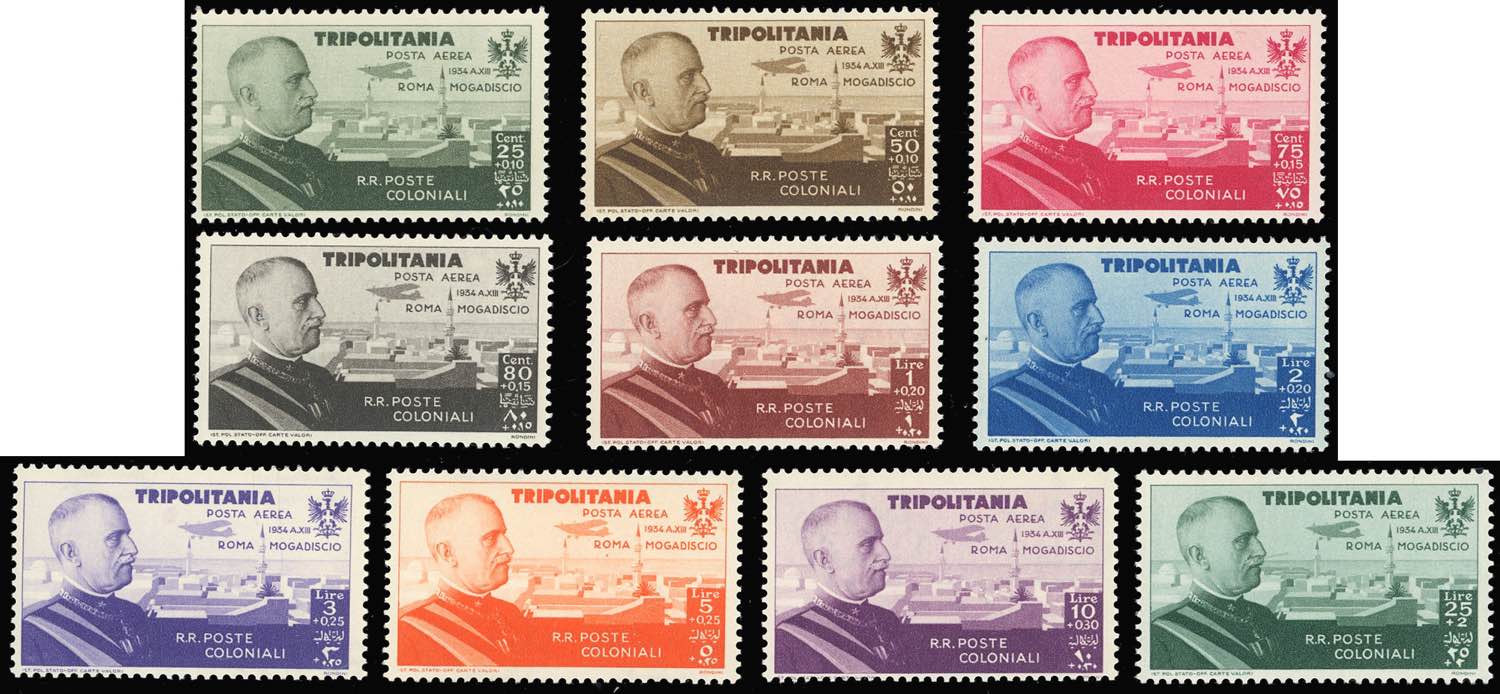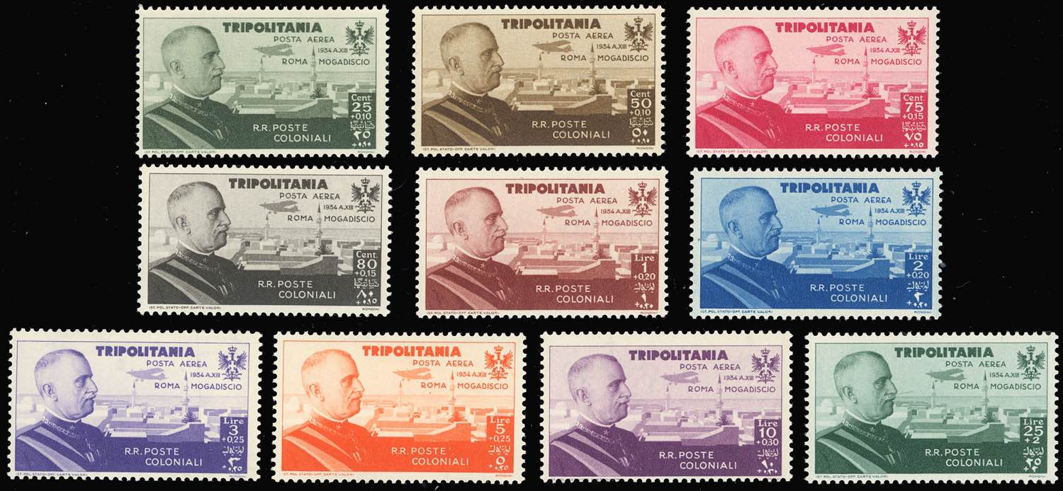 COLONIE ITALIANE POSTA AEREA 1934 - Volo Roma-Mogadiscio, due serie complete di Eritrea ed una di Tripolitania, nuove, gomma originale ... Leggi tutto