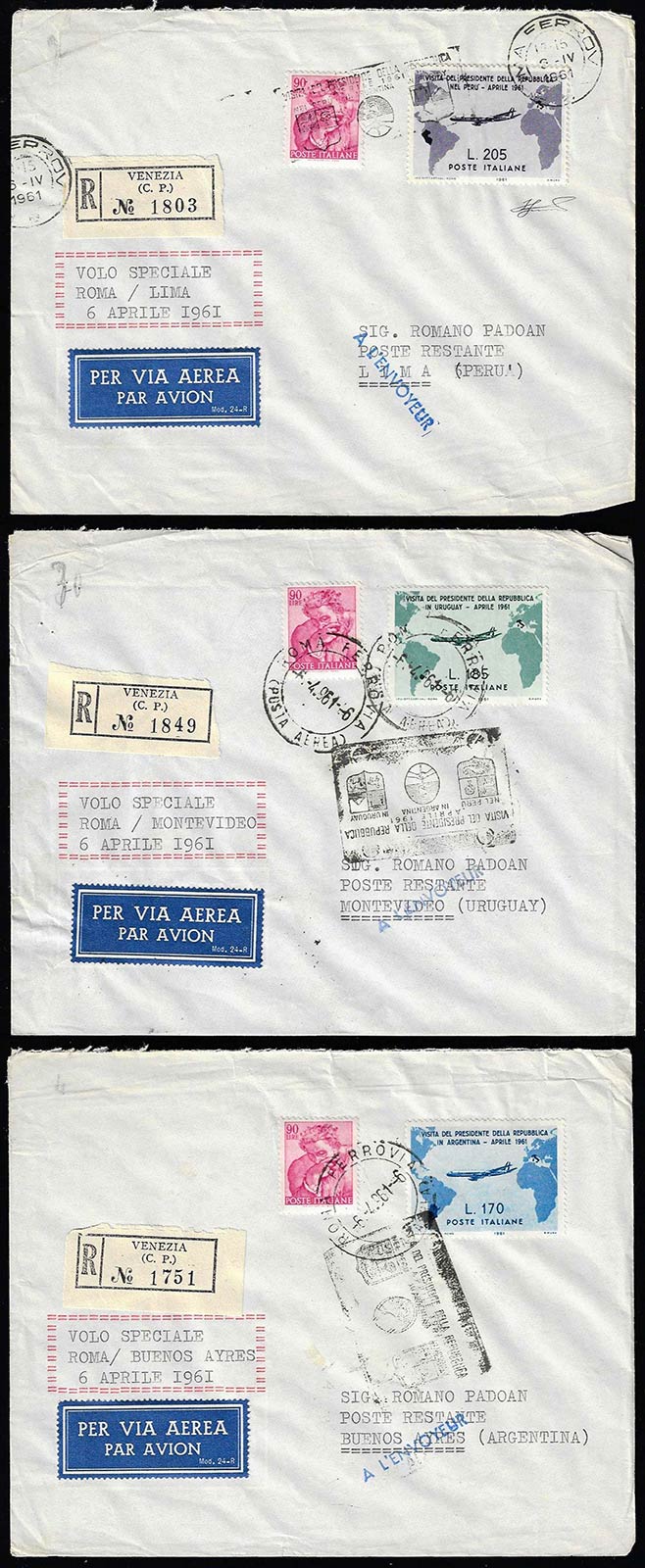 1961 - 205 lire Gronchi rosa (921), ricoperto, con complementare, su aerogramma raccomandato da Venezia, annullo speciale del volo di Roma 6/4/1961, a Lima, bolli di arrivo al verso, ritornato al mittente. Allegati due aerogrammi con gli altri valori della serie.