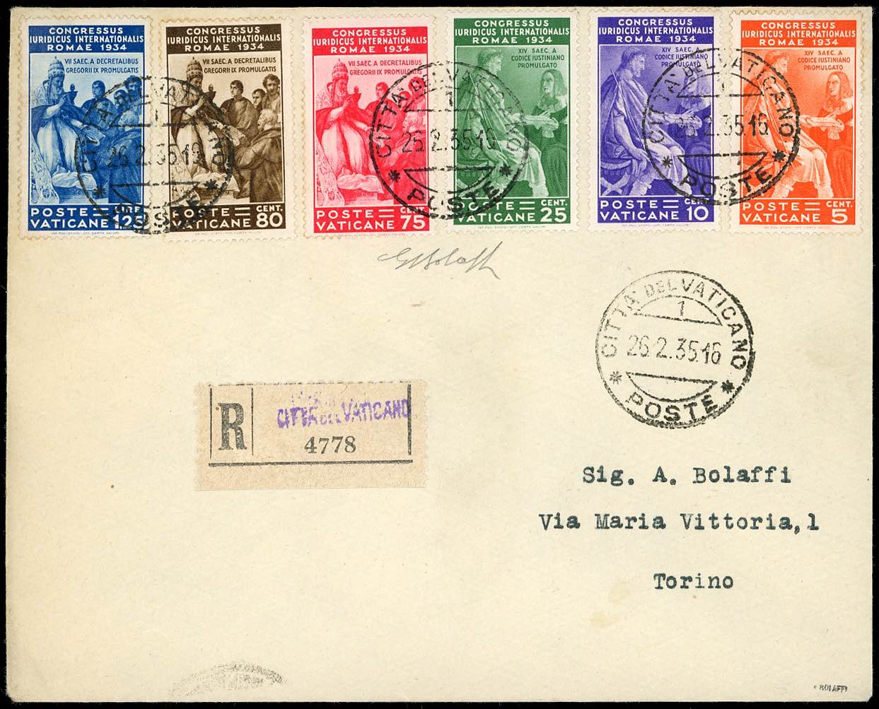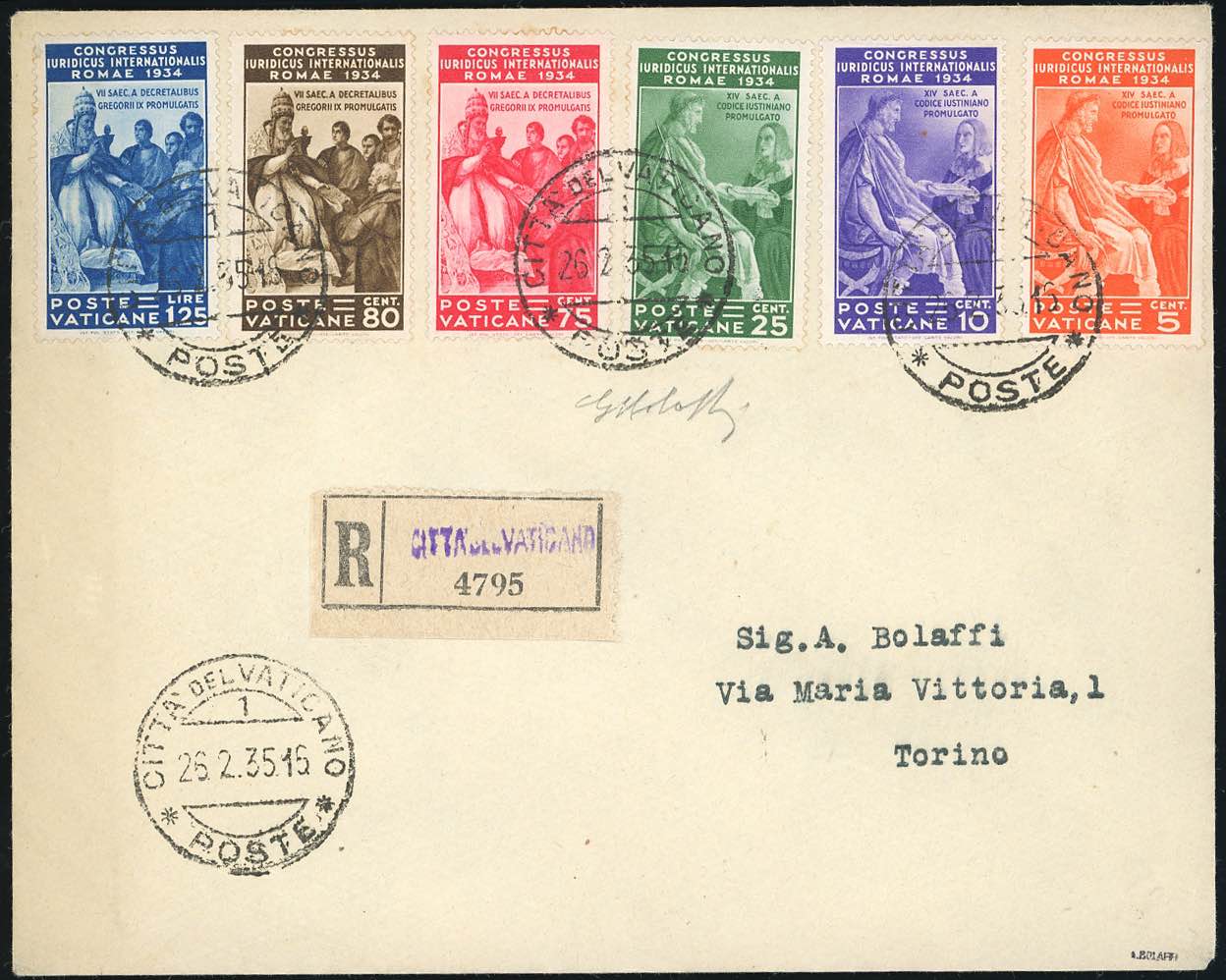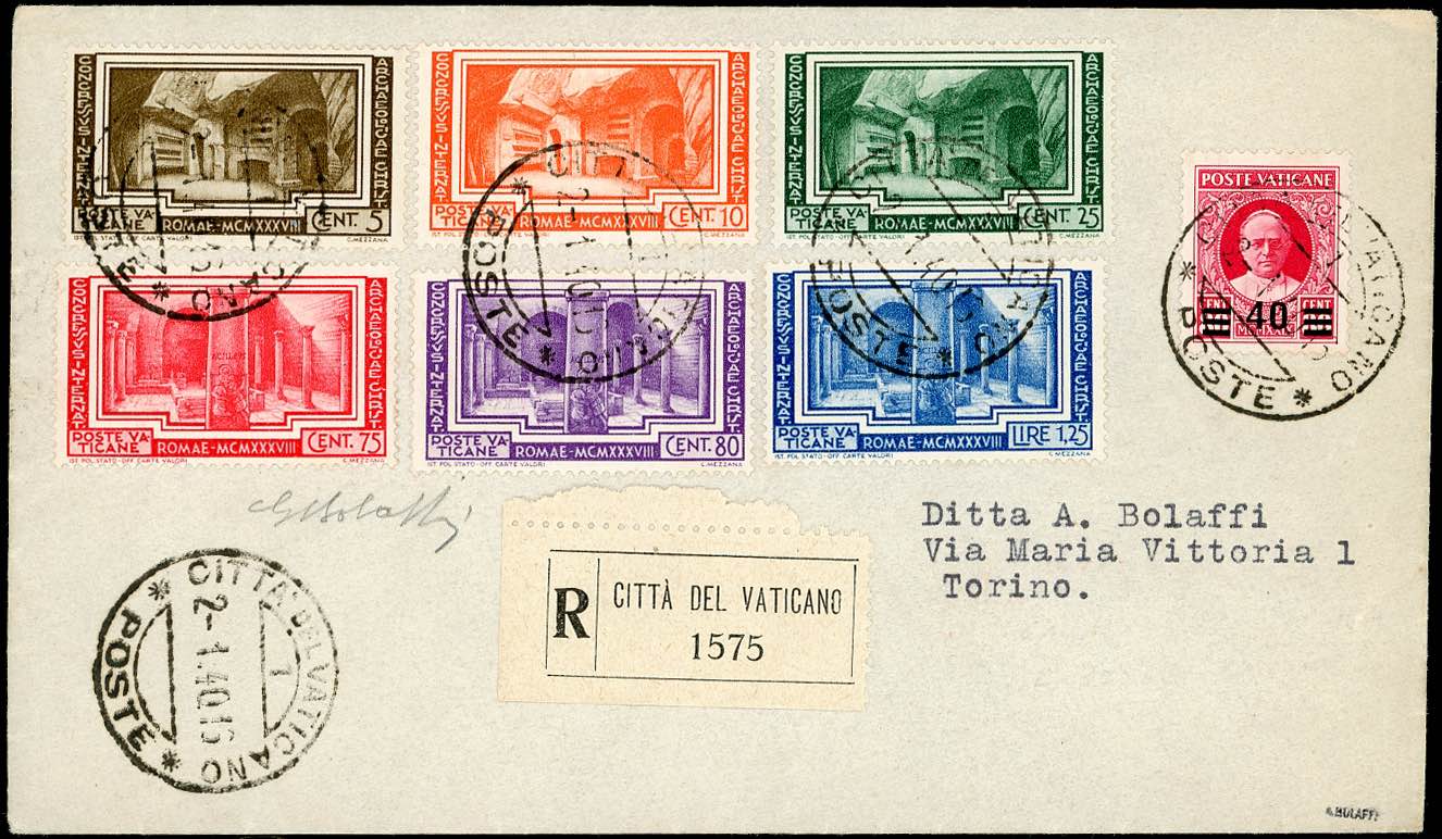 VATICANO 1934/1935 - Due buste raccomandate affrancate con serie completa Giuridico (41/46), e cinque con Archeologia (55/60) e complementari, tutte di ottima qualità e firmate G.Bolaffi.